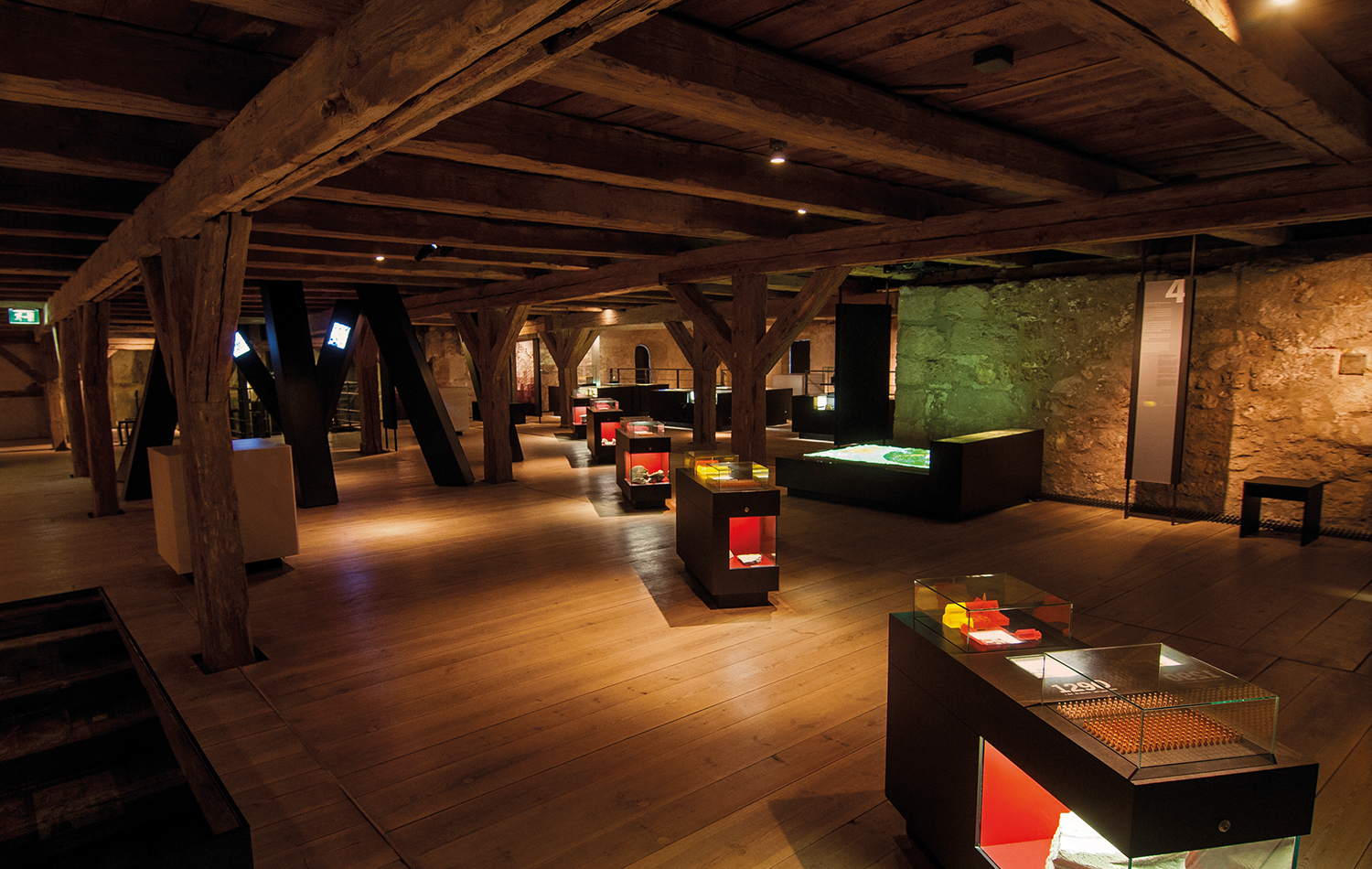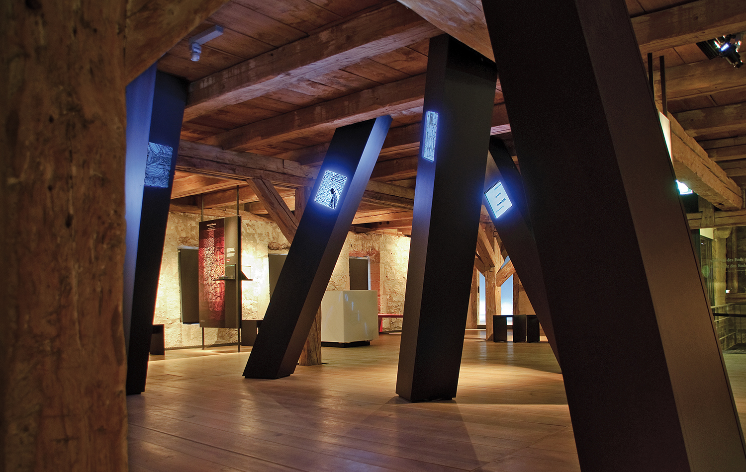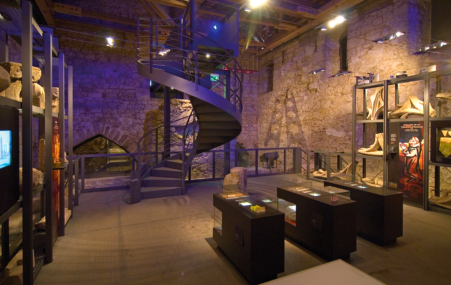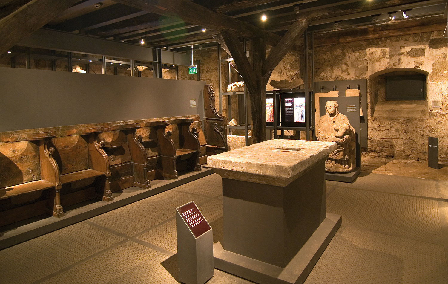Im vollständig erhaltenen Klausurgebäude aus dem 13. Jahrhundert, setzt moderne Ausstellungsarchitektur gezielt Kontrapunkte. Rote Ausstellungselemente verstärken die Wahrnehmung der mittelalterlichen Bausubstanz.