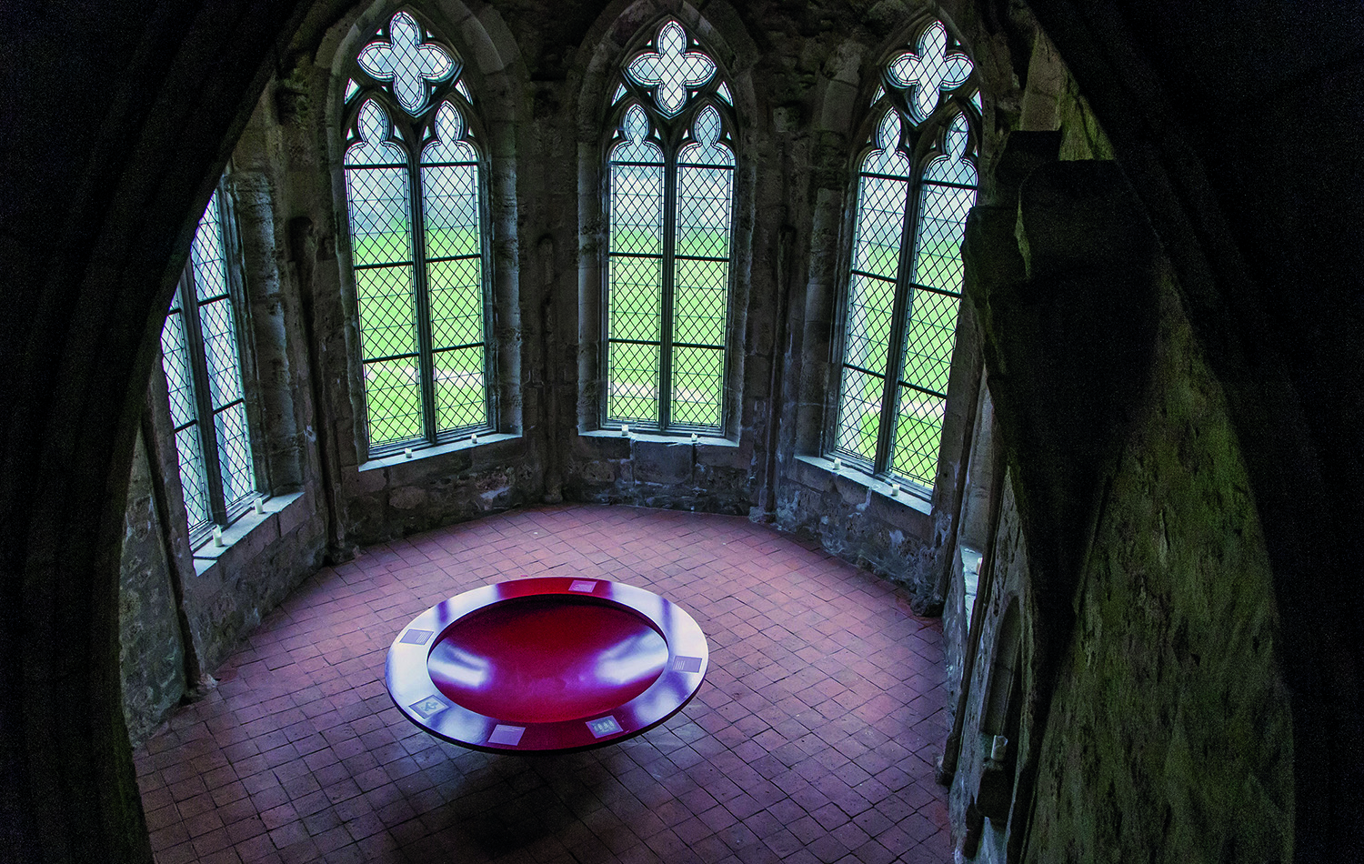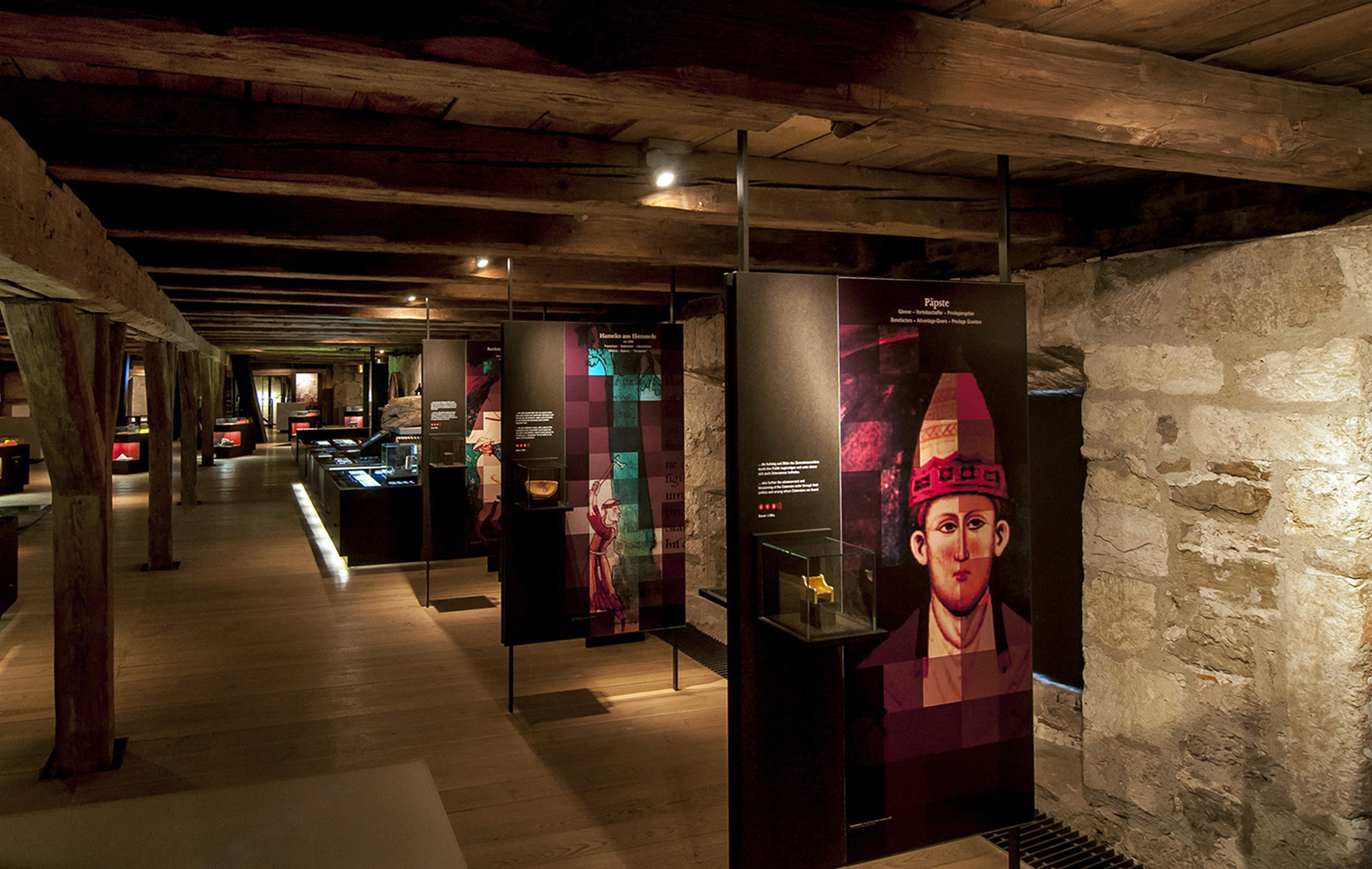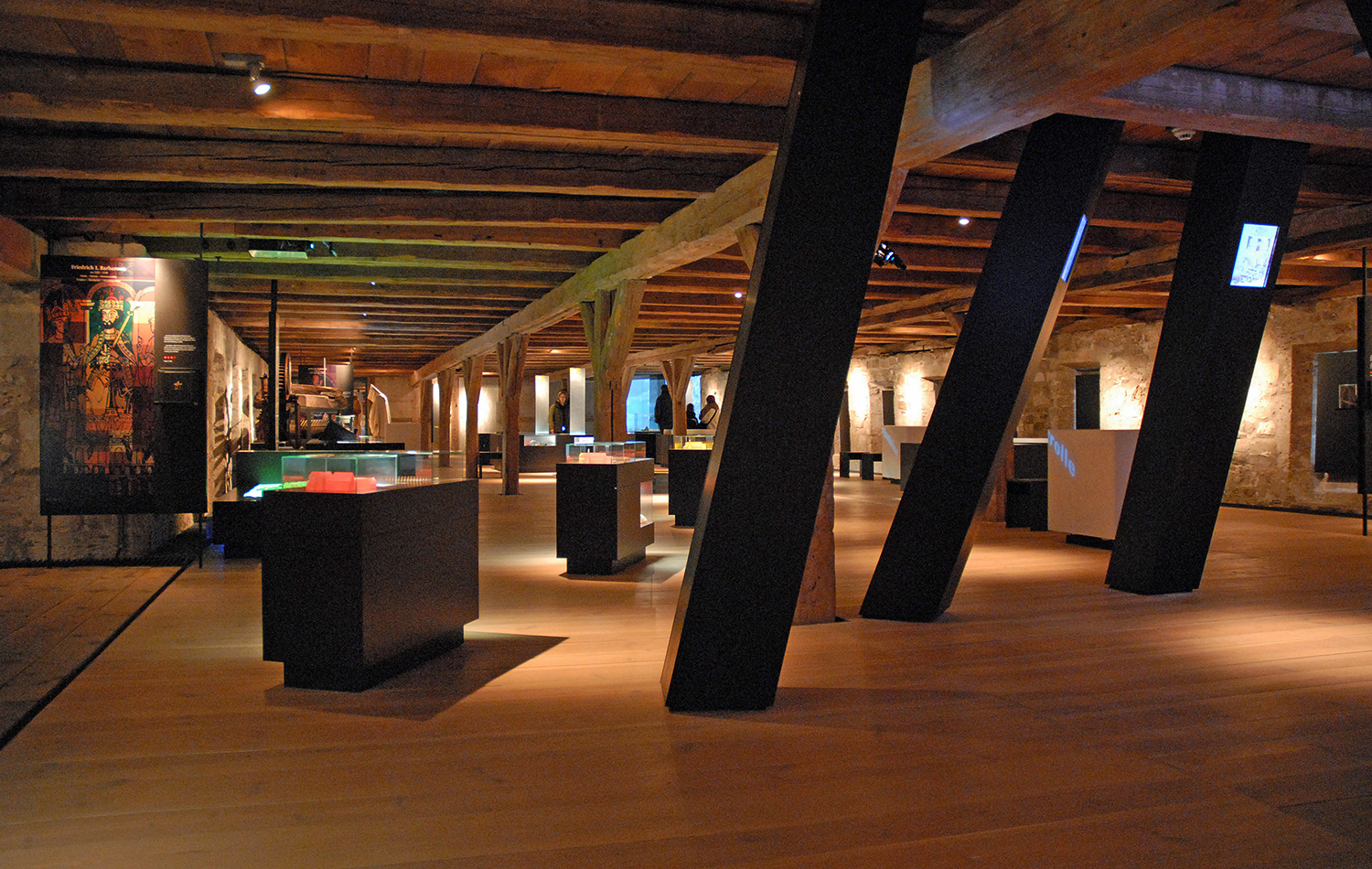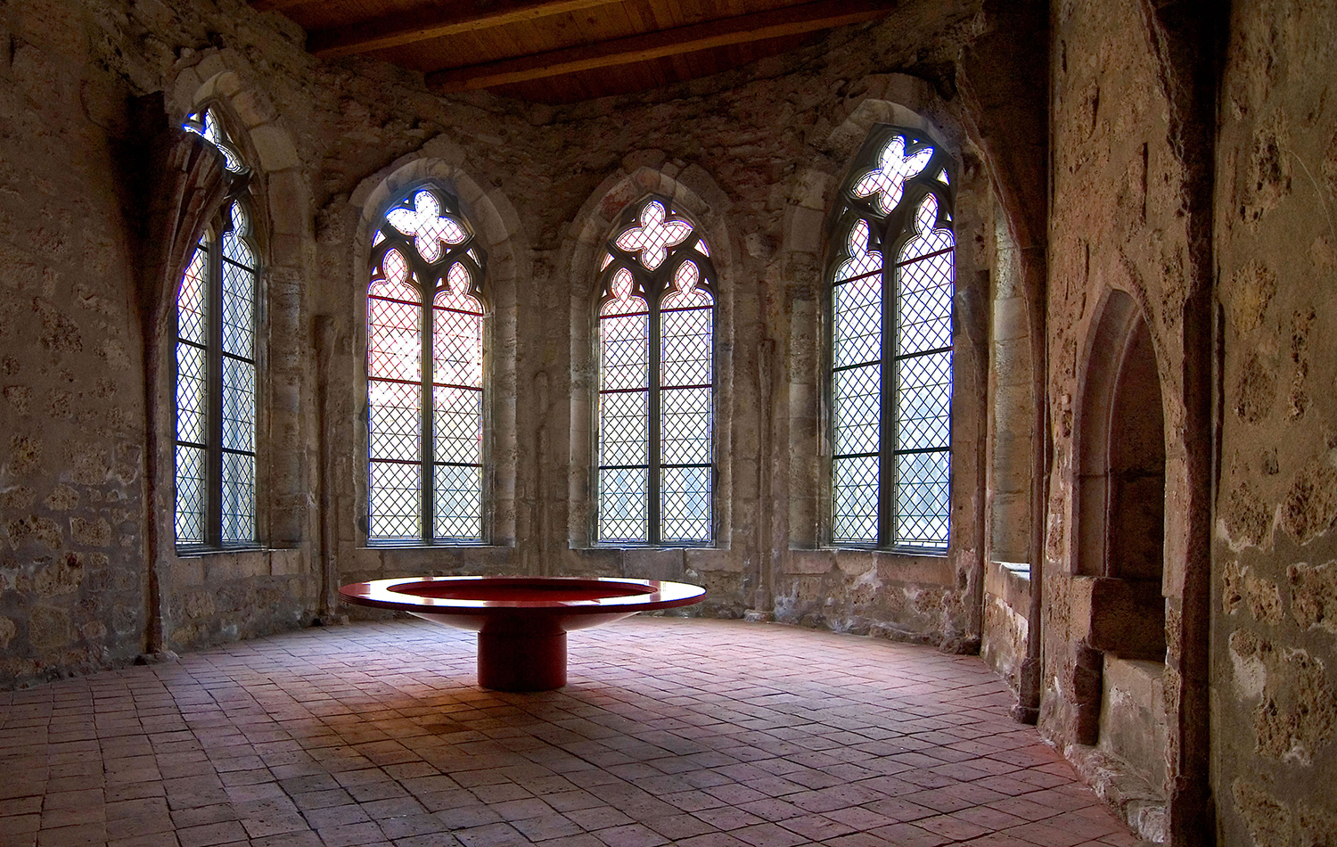 Im vollständig erhaltenen Klausurgebäude aus dem 13. Jahrhundert, setzt moderne Ausstellungsarchitektur gezielt Kontrapunkte. Rote Ausstellungselemente verstärken die Wahrnehmung der mittelalterlichen Bausubstanz.