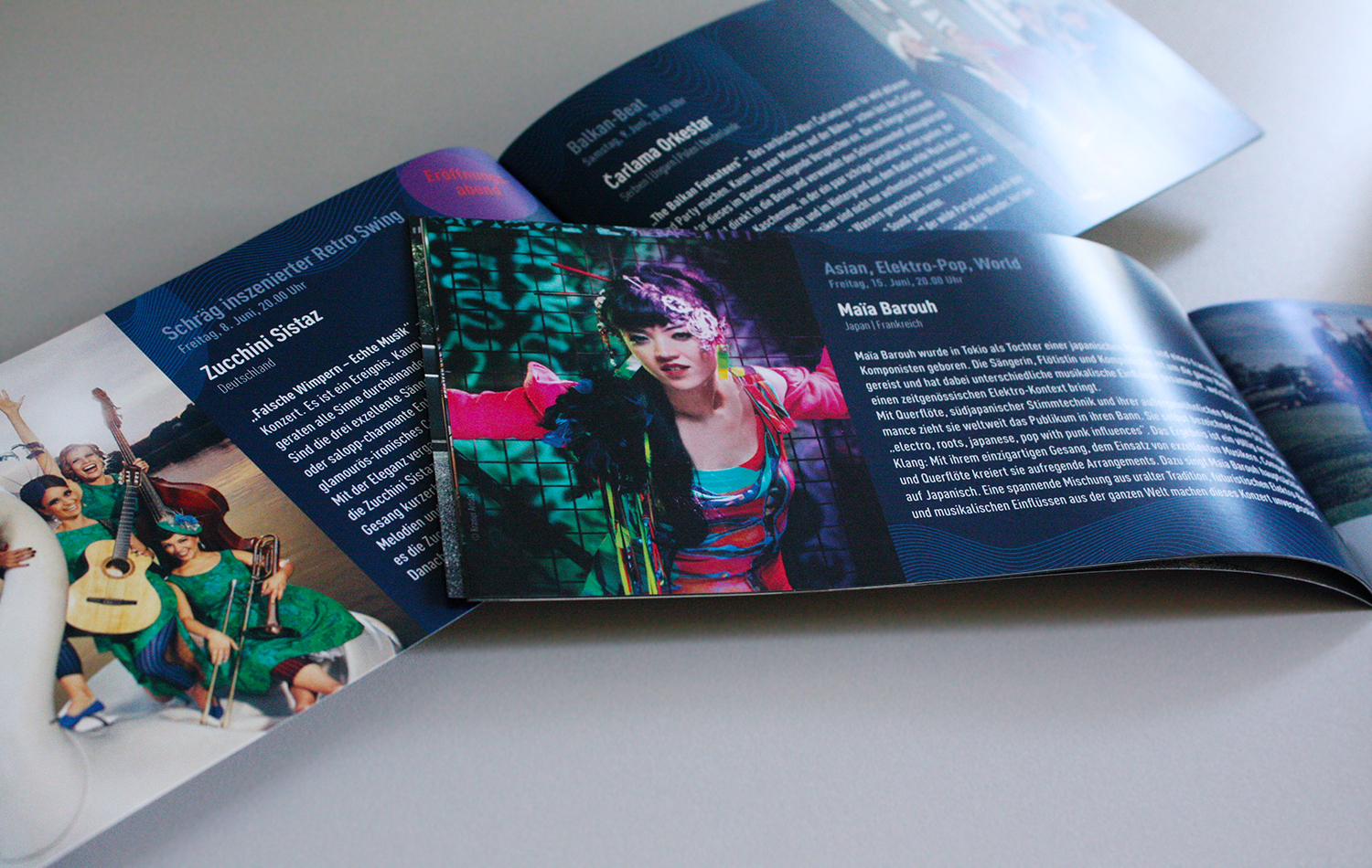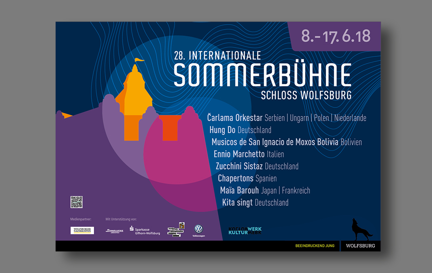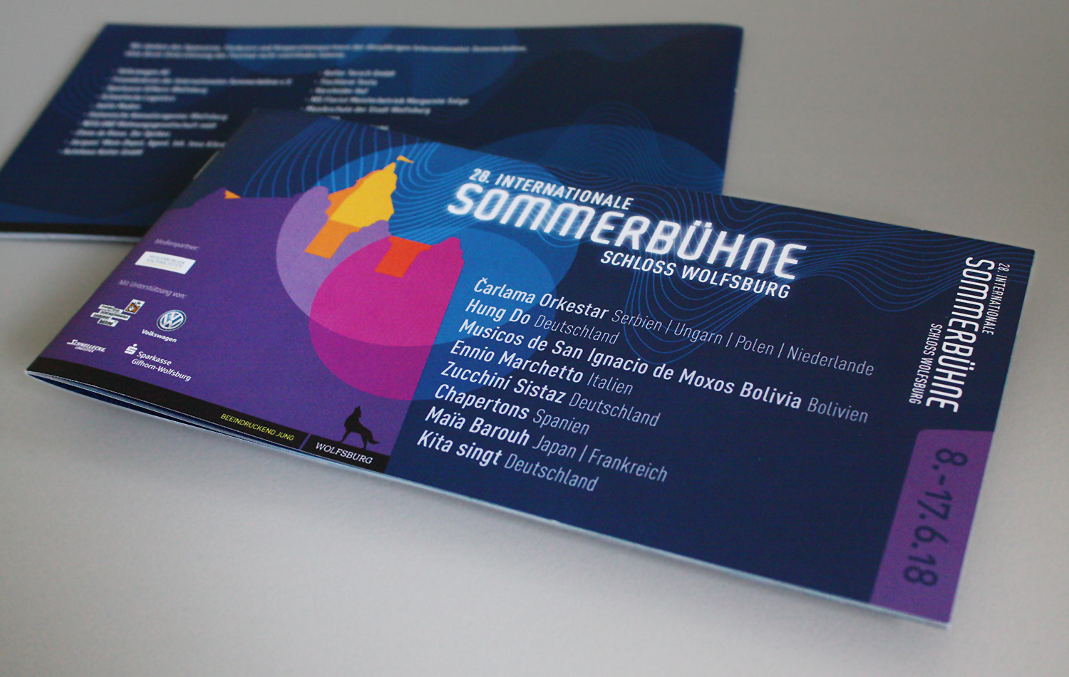 Für die aktuellen Veranstaltungen der Internationalen Sommerbühne Wolfsburg werden unterschiedliche Medien entworfen: Programmheft, Eintrittstickets, Plakate, Großflächenplakat, Anzeigen, RollUp-Banner.