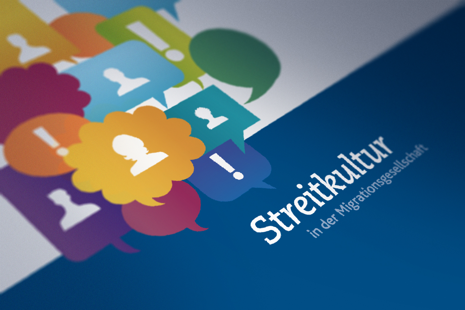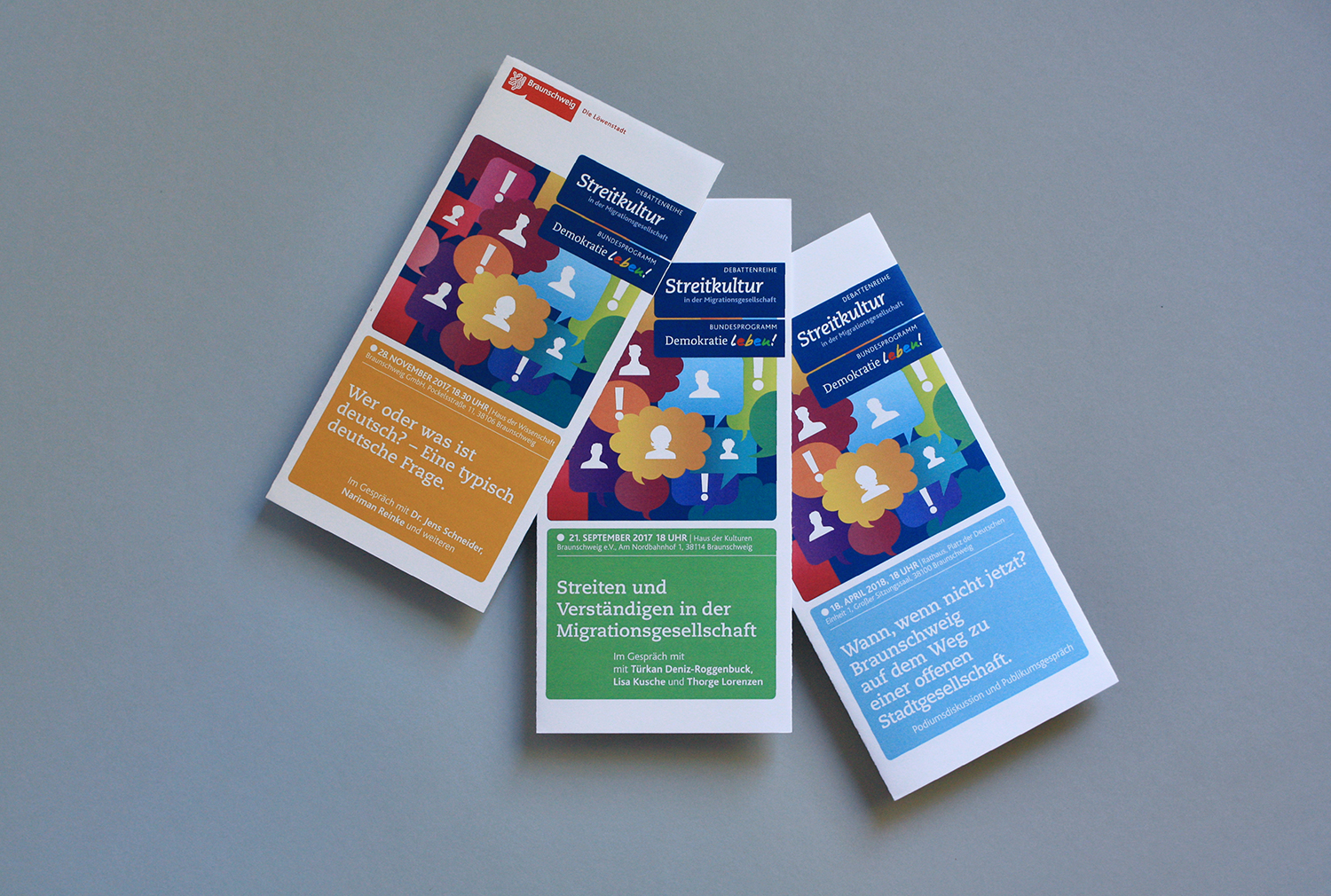 Für die Veranstaltungreihe der Stadt Braunschweig zum Thema »Streitkultur« wurde ein eigenes Key-Visual entwickelt. Eine wichtige Eigenschaft ist seine sprachübergreifende Lesbarkeit.