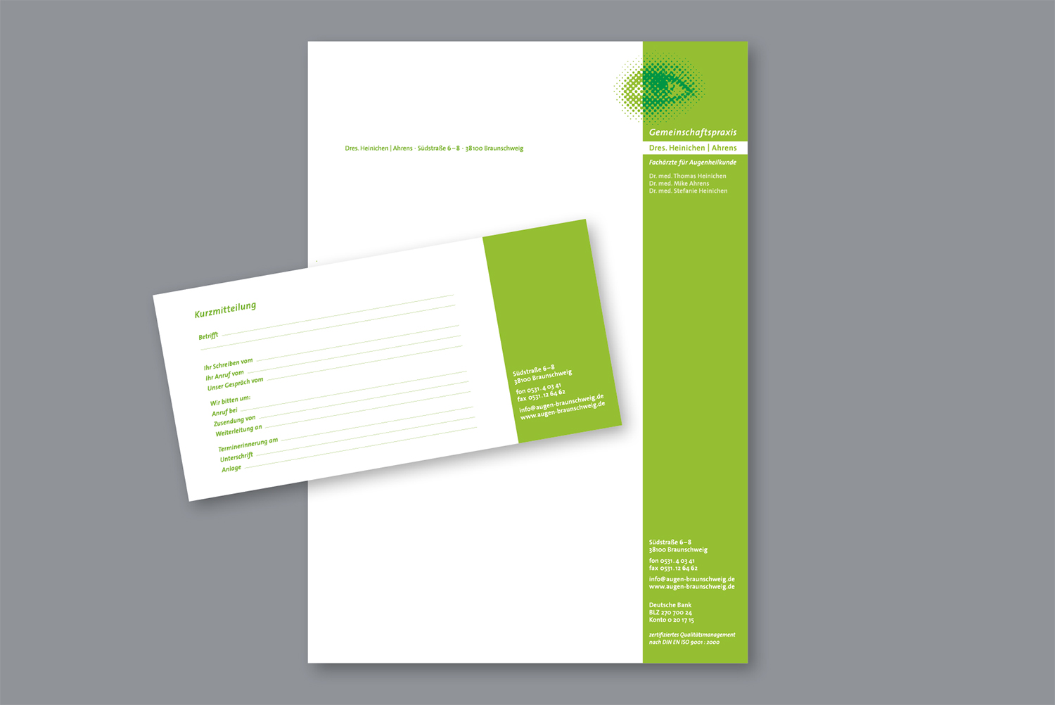 Umsetzung des entwickelten Corporate Designs auf alle in der Praxis erforderlichen Printmedien. Auch die Beschilderung im Gebäude folgt konsequent den Vorgaben für die Gestaltung.