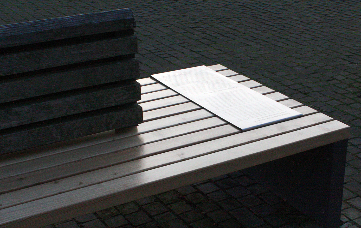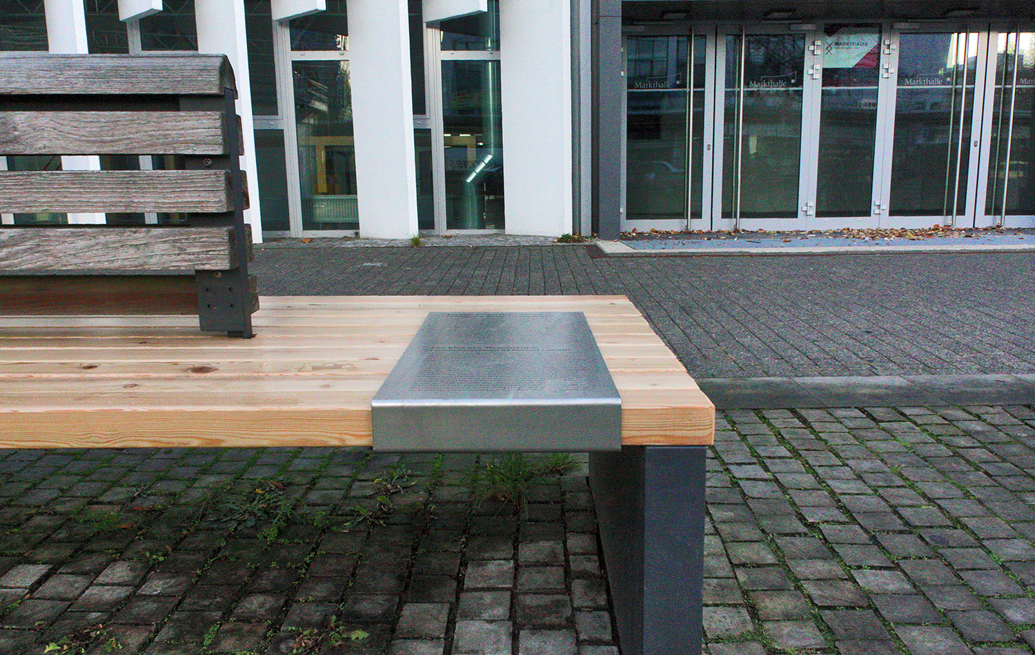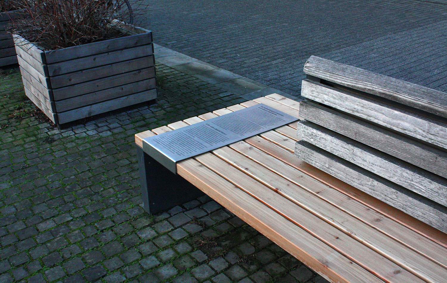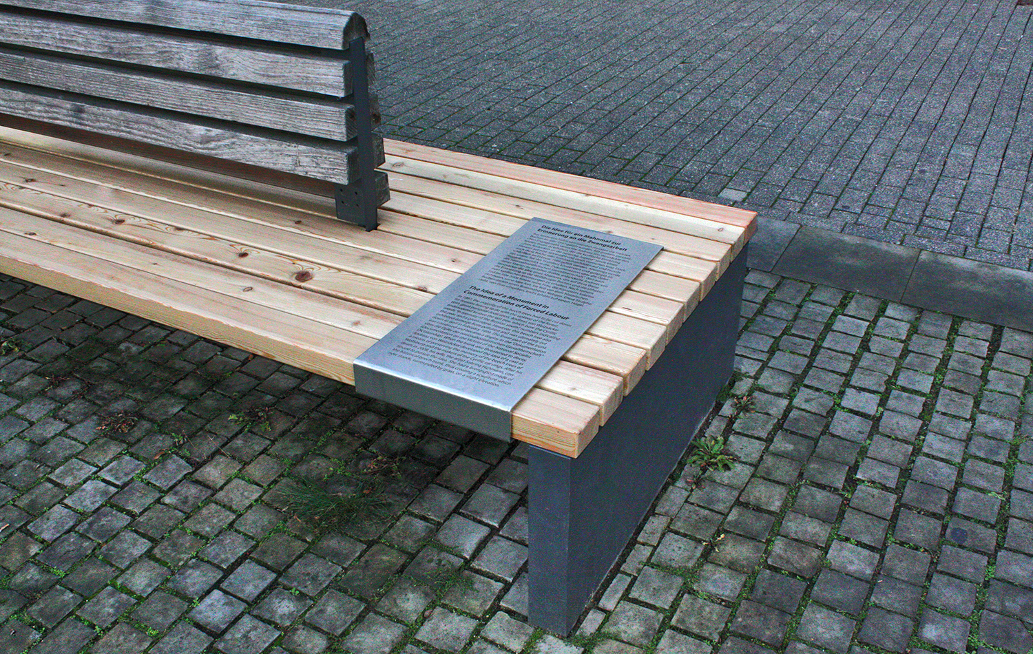 Die Idee ist es, die Informationen zum Gedenkort in die bestehende Gestaltung des Ortes selbst zu integrieren. Edelstahlklammern mit lasergraviertem Text ergänzen die Sitzbänke ohne gesonderte Trägenkonstruktion.