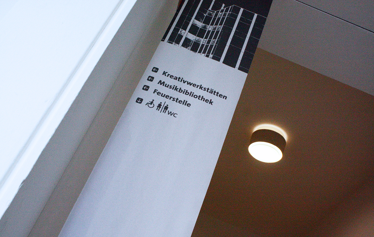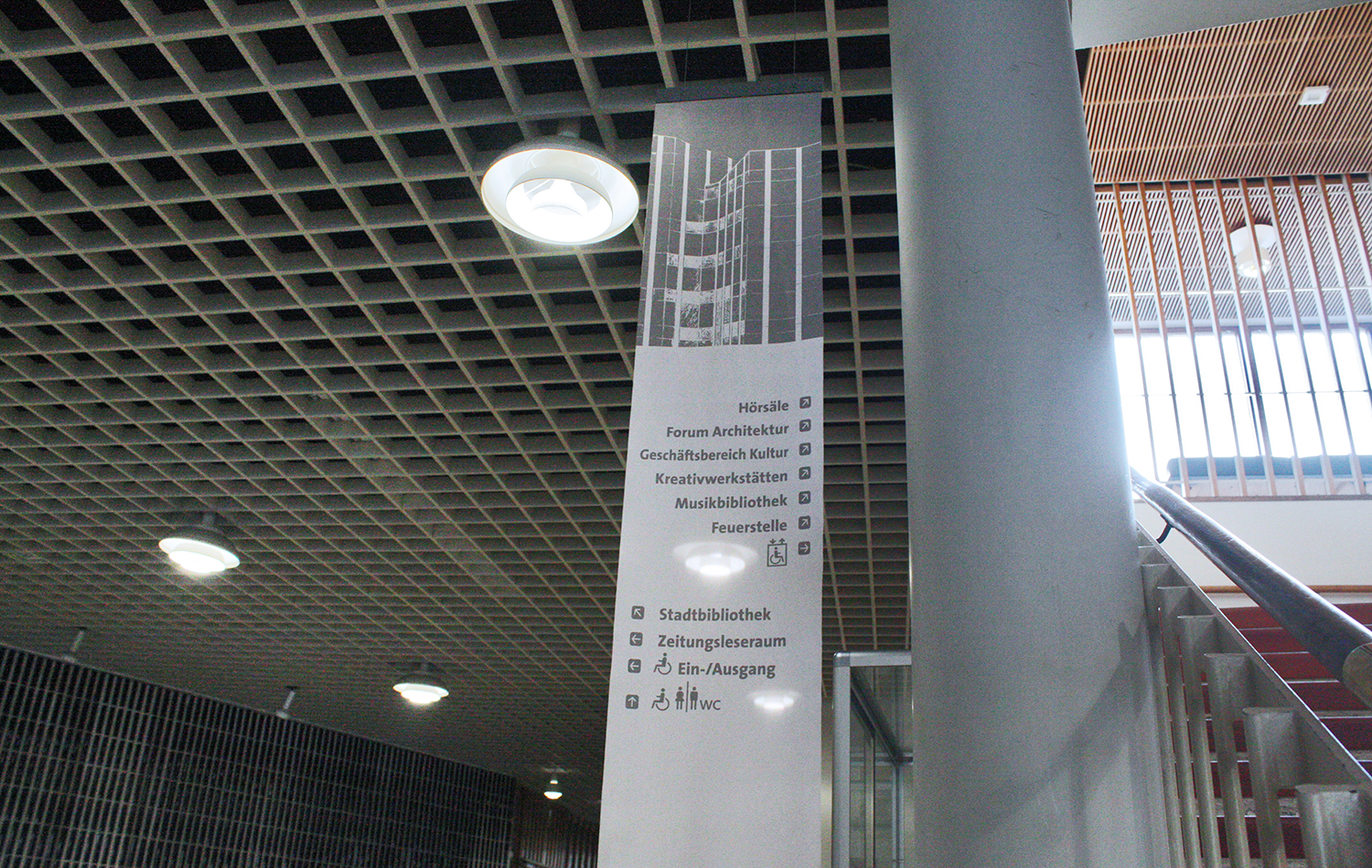 Im Alvar Aalto Kuturhaus kommt eine Kombination aus freistehenden Stelen und fest montierten Bannern zum Einsatz. Die Stelen informieren über hervorragende Aspekte der seinerzeit innovativen und auch heute noch faszinierenden Architektur. Banner geben dem Besucher in den Schaufenstern und im Gebäude alle erforderlichen Informationen zur schnellen Orientierung. Die Inhalte sind flexibel und jederzeit einzeln veränderbar.