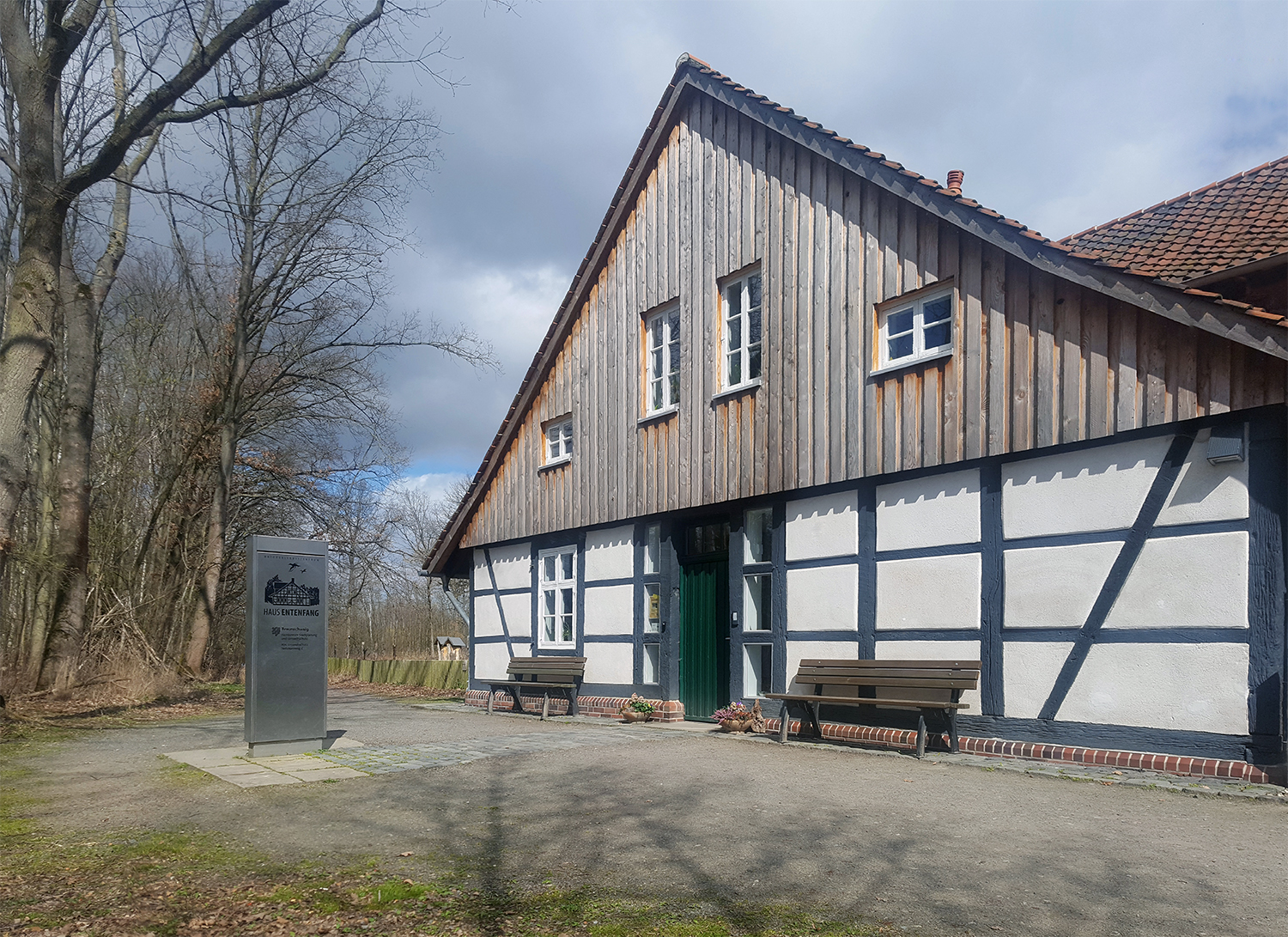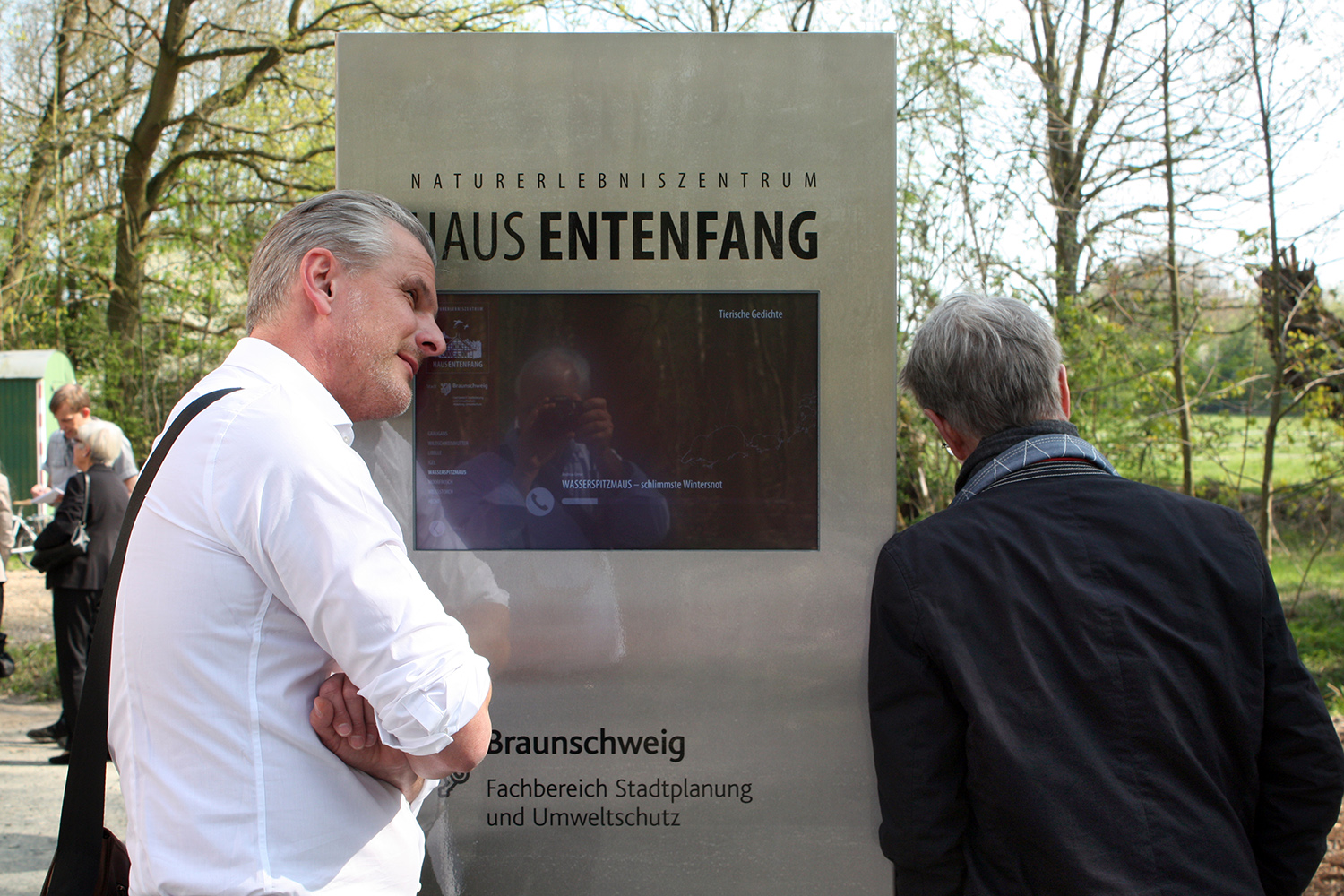 Die Stele am Haus Entenfang gibt dem Besucher Orientierung im Naturschutzgebiet Riddagshausen und bietet eine Essenz von Informationen auch außerhalb der Öffnungszeiten des Hauses. Über Tuochscreen sind die Inhalte frei zugänglich. Eine Hörstation ist integriert.