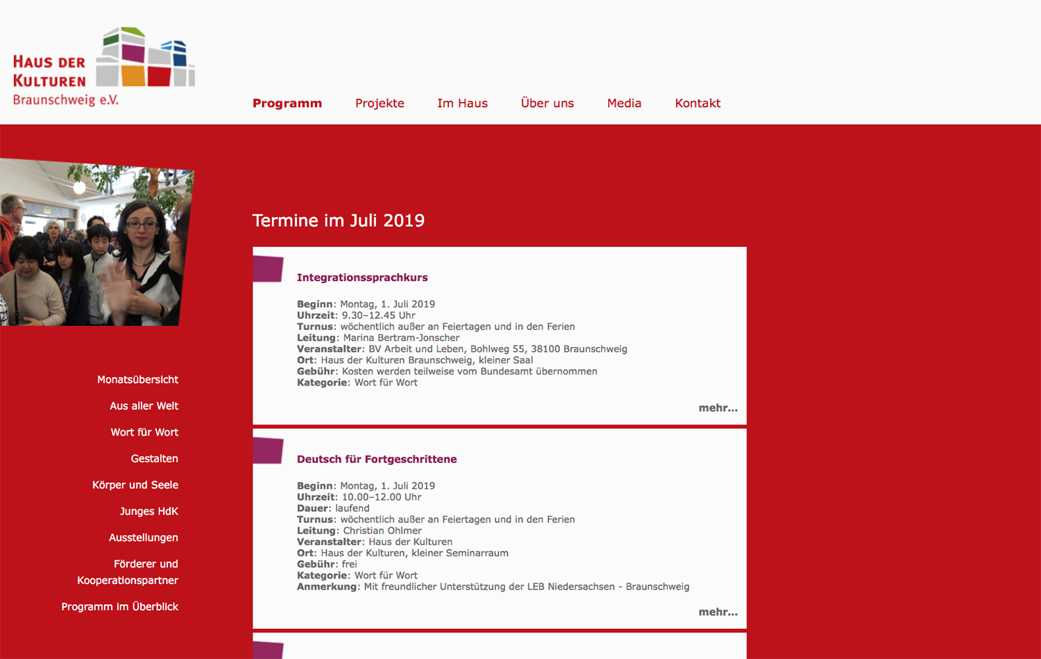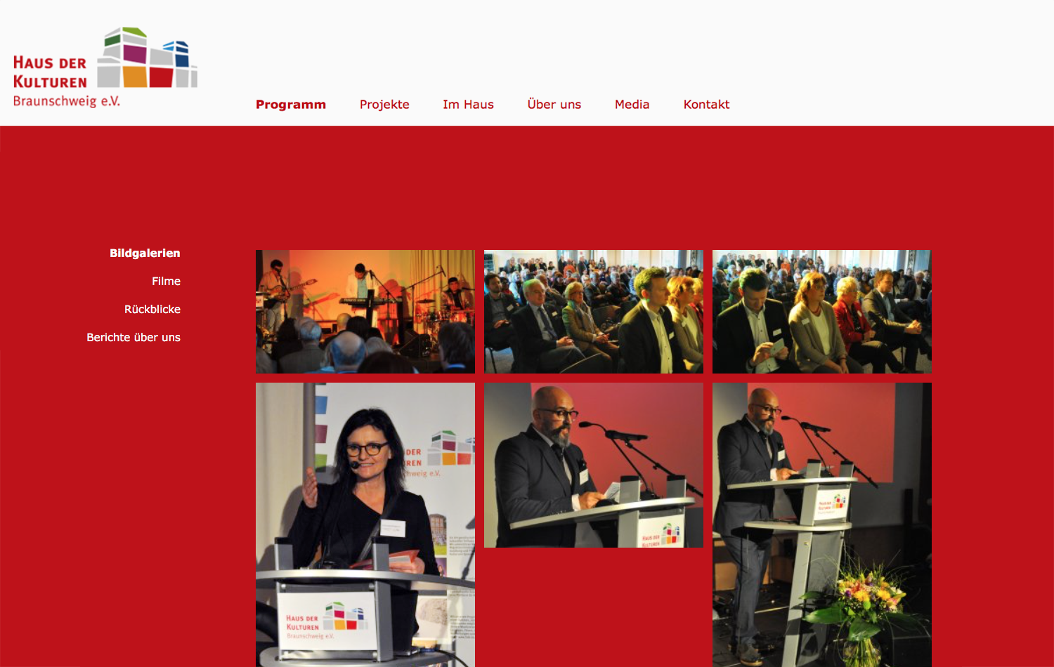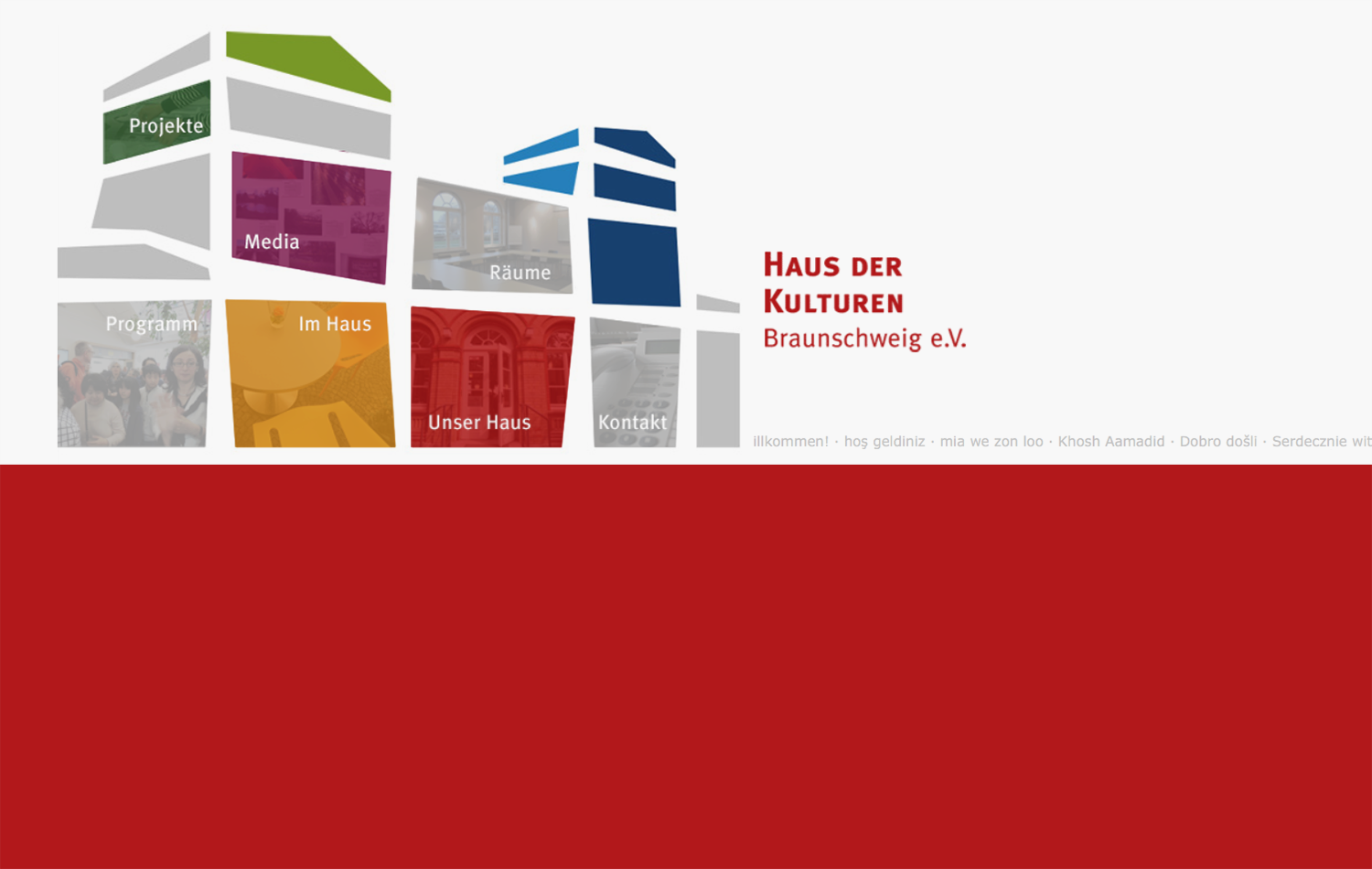 Konzeption, grafischer Entwurf und Umsetzung der Website in Form eines leicht zu handhabenden Content-Management-Systems. Die Aktualisierung und das laufende Einpflegen aller Daten erfolgt durch das Haus der Kulturen in eigener Regie.