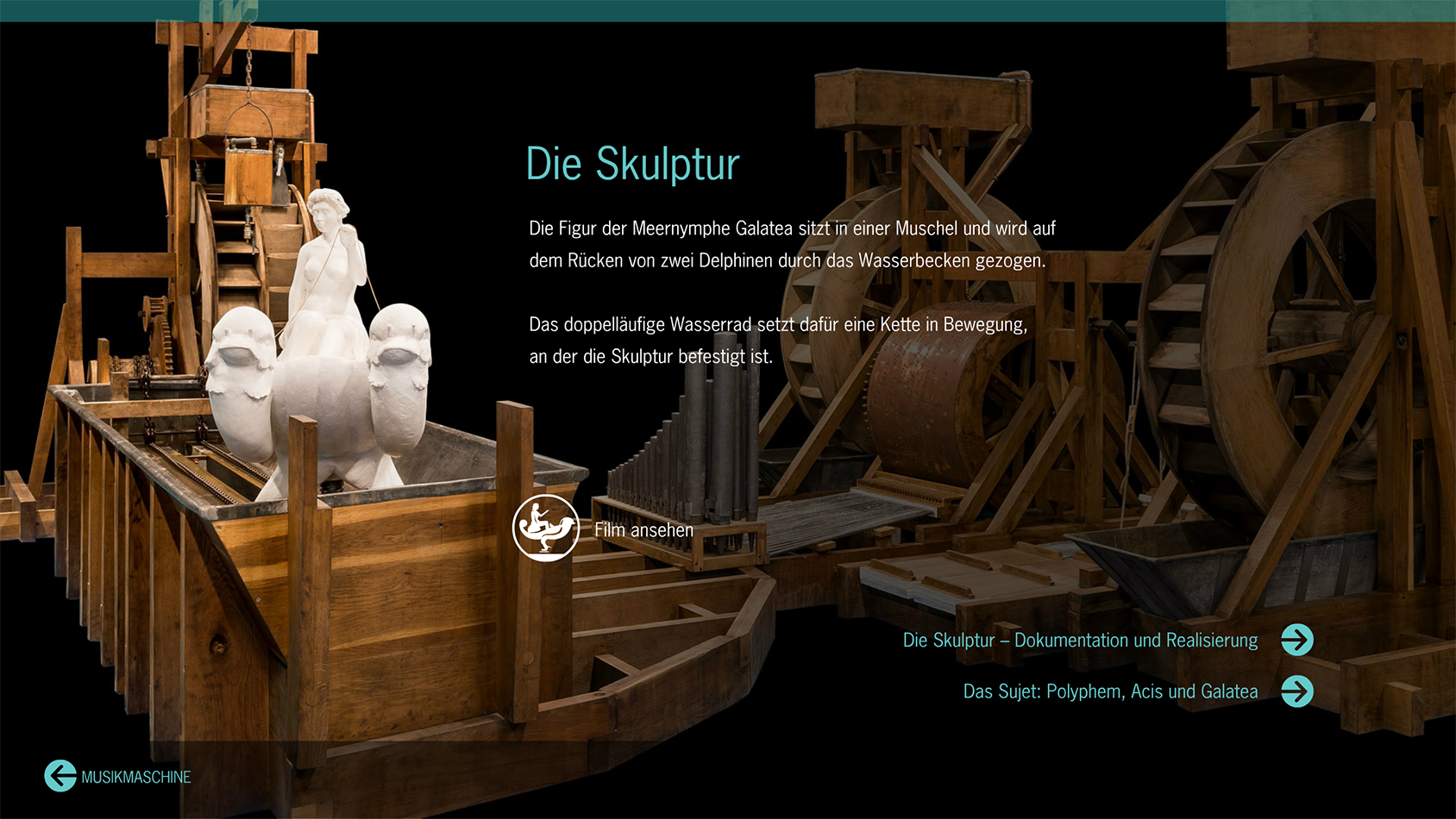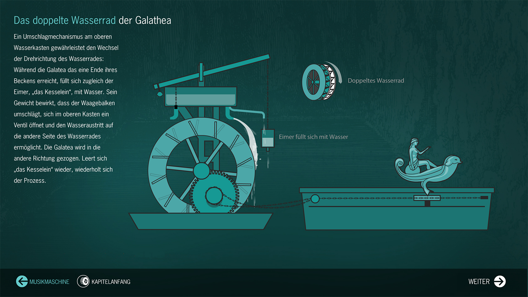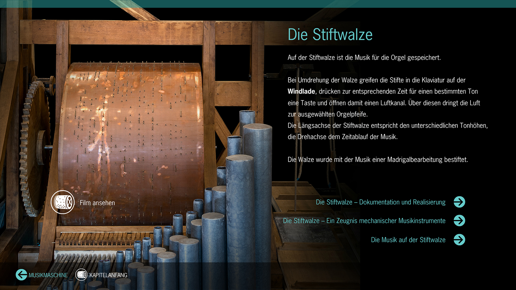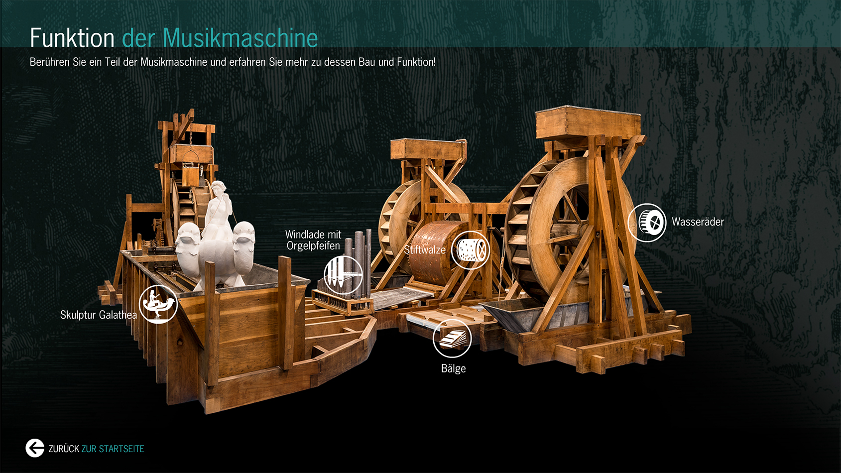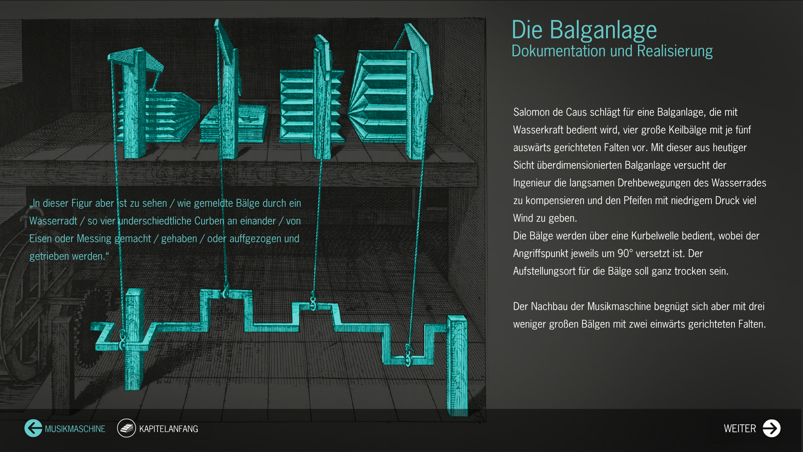 Die geniale Vielschichtigkeit der fortschrittlichen Erfindung wird über die Medienstation dargestellt. Animationen, Filme und audioakustische Clips illustrieren die Konstruktion und den geschichtlichen Hintergrund. Für Kinder ist ein eigener Erzählstrang eingebunden.