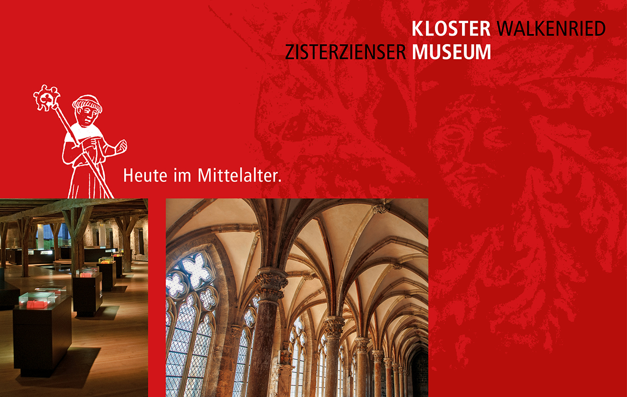 Die Grafik des Erscheinungsbildes übernimmt wesentliche Elemente der Ausstellungsarchitektur. Das kräftige Rot und die strengen Formen sind Basis der Gestaltung. Mit dem geheimnisvollen Gesicht eines Schlusssteins des Kreuzgewöbes erzählt das Design von der Mystik des Ortes.